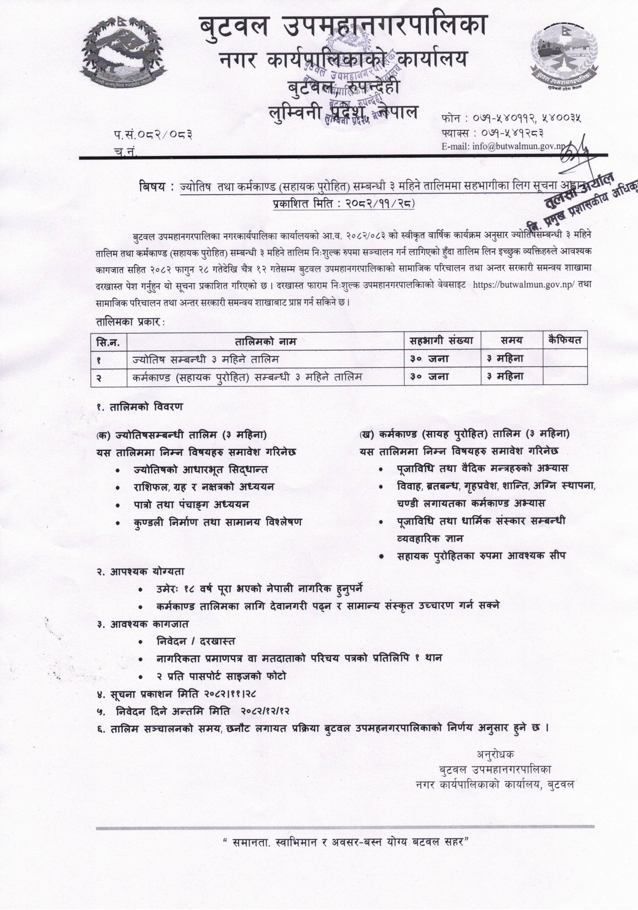 ज्योतिष तथा कर्मकाण्ड (सहायक पुरोहित) सम्बन्धी ३ महिने तालिममा सहभागीका लागि सूचना ।