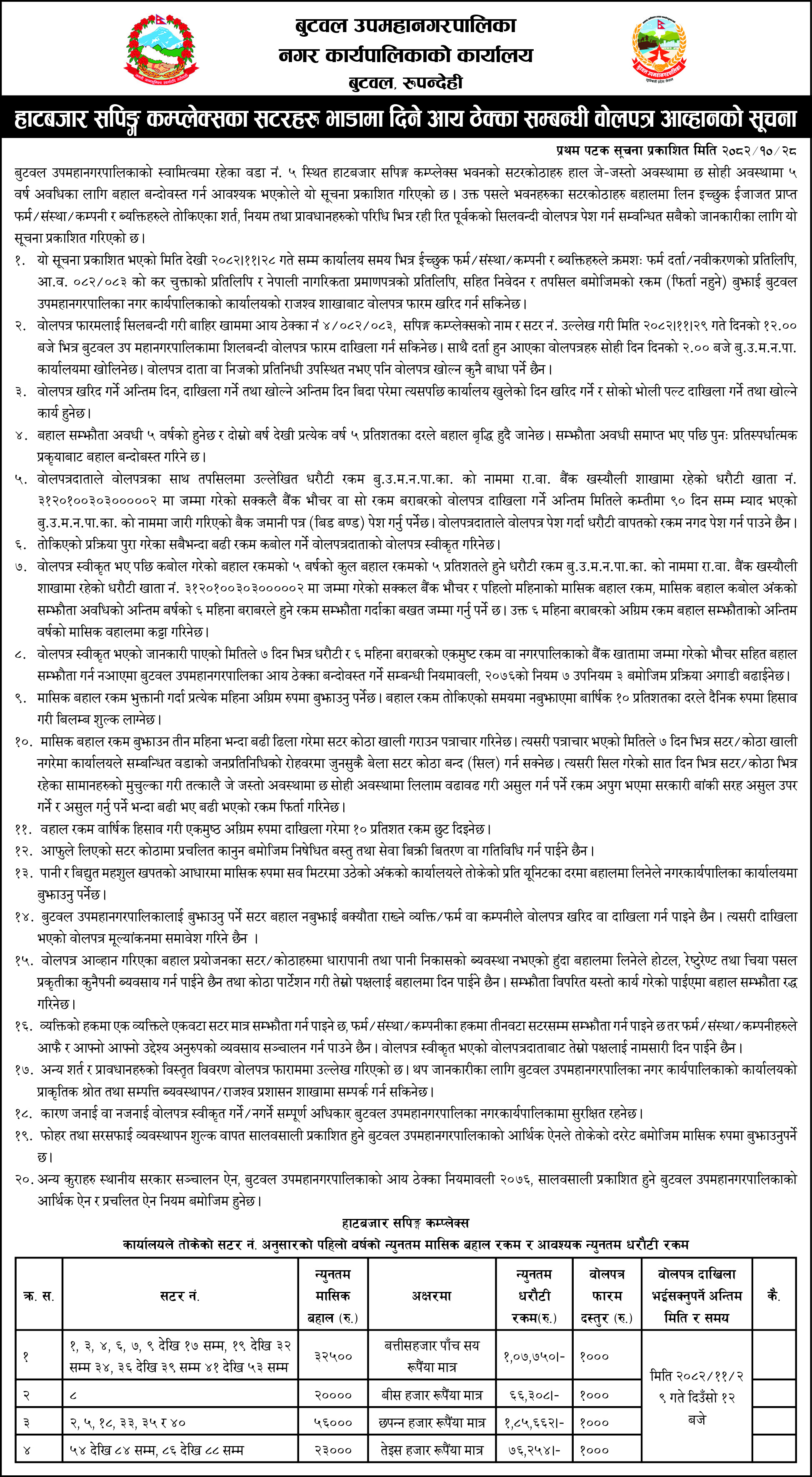 » हाडबजार सपिङ्ग कम्प्लेक्सका सटरहरु भाडामा दिने आय ठेक्का सम्बन्धी वोलपत्र आव्हानको सूचना ।