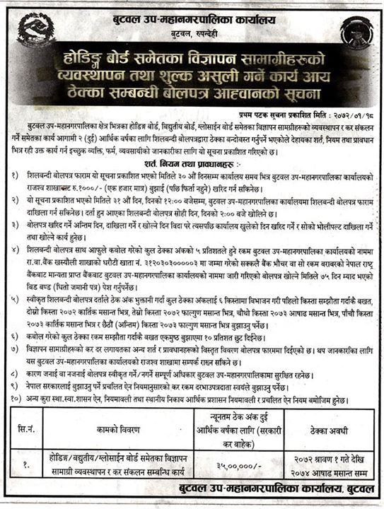 होडीङ्ग बोर्ड समेतका विज्ञापन सामाग्रीहरुको व्यस्थापन तथा शुल्क असुली गर्ने कार्य आय ठेक्का सम्बन्धी बोलपत्र आव्हानको सूचना